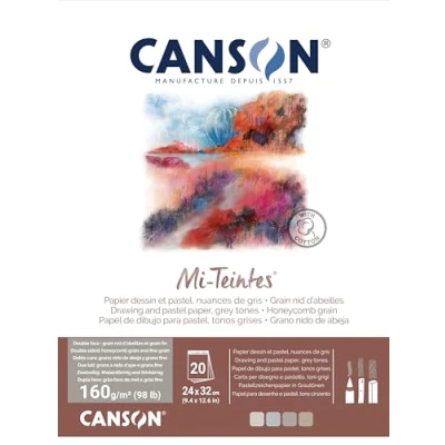 CANSON Mi Teintes Coloured Drawing 160gsm 24x32cm Paper Pack, Double Sided: Honeycomb & Fine Grain, Pad Glued Short Side, 4 Grey Tones, 20 Sheets, Ideal for Professional Artists Illustrators