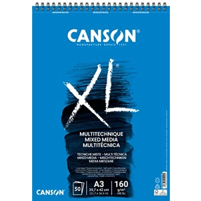 CANSON XL Mixed Media 160gsm A3 Paper, Light Grain, Spiral Pad Short Side, 50 White Sheets, for Professional Artists & Students