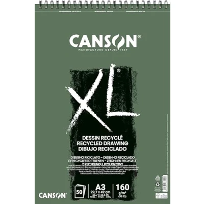 CANSON XL Recycled Drawing 160gsm A3 Paper, Fine Honeycomb Grain, Spiral Pad Short Side, 50 White Sheets, Ideal for Professional Artists & Illustrators