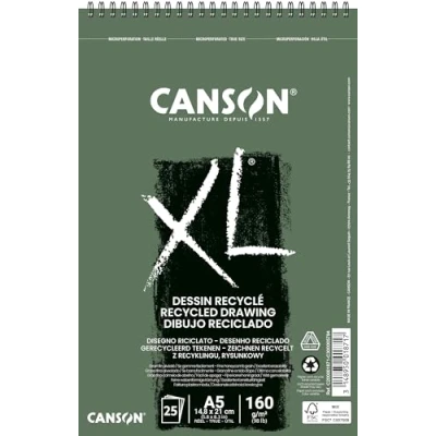 CANSON XL Recycled Drawing 160gsm A5 Paper, Fine Honeycomb Grain, Spiral Pad Short Side, 25 White Sheets, Ideal for Professional Artists & Illustrators