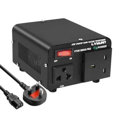 HIGH VOLTAGE TRANSFORMER- This power transformer can be used in 110 Volt countries and 220 Volt countries. It will convert from 220-240 Volts to 110-120 Volts & from 110-120 Volts to 220-240 Volts. 500 WATT STEP UP/ DOWN VOLTAGE TRANSFORMER - 500VA is only peak power, This step up transformer and step down transformer can be used for electronics, household appliances or heavy duty machines not exceeding 350 Watts. The Voltage Transformer can use for both home use and commercial applications. Apply for many kinds of small household electrical appliances. 110V Socket & 220V UK Socket. Included a UK standard plug. (You could buy a US plug by yourself, if you go to 110V country.) FUSE PROTECTED POWER TRANSFORMER - Dual Fuse Protection (120V & 230V). Two outlets on front of the unit, On/Off Power Switch with Indicator Light. 5 YEAR PARTS & LABOR WARRANTY - Specialized customer service team & technical installation support via email, phone or chat