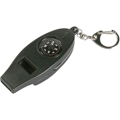 Whistle with compass, thermometer and magnifying glass Touret in the chain Can be used as a keyring or belt clip Safety item for hiking Plastic 2 x 8.2 x 3 cm, 23 g