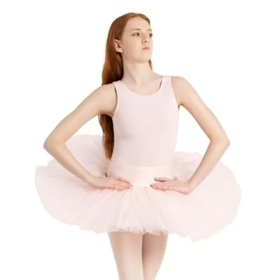 Structured, stiff tulle Seven layer traditional practice tutu withelasticized knit waistband and full brief Skirt 100% Polyester Brief 82% Nylon/18% Spandex
