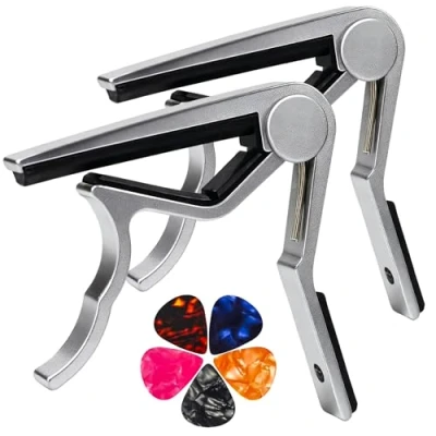 Quick Release Design: Effortless to clip onto your guitar and swift to switch—even mid-song. Just clamp it on, and let your melodies soar without missing a beat. Versatile Compatibility: This guitar capo works seamlessly with steel-string acoustic guitars, electric guitars, banjos, mandolins, and ukuleles, making it a must-have in any guitar accessories collection. Clear Tone, No Buzz: Equipped with a strong spring, it delivers balanced pressure across the fretboard, ensuring crisp, buzz-free sound every time you play. Durable & Protective: Crafted from high-grade aluminum alloy with soft silicone pads, this capo for acoustic guitar and electric models safeguards your instrument from scratches or damage. What You Get: 2 sleek guitar capos (perfect as guitar gifts for men) paired with 5 cool guitar picks, all packaged in a vibrant color box. Ideal for both acoustic guitar capos users and electric guitar players, this set combines functionality with style—essential for any guitarist’s toolkit.
