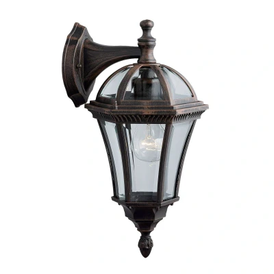 Outdoor wall lamp Capri with downward lantern The outdoor wall lamp Capri is protected against the penetration of splashing water with IP44 and can be used anywhere outdoors as a facade lighting, such as a home entrance lighting or as a light source on the terrace or balcony. It is made of durable aluminum with a rustic brown finish, the antique design fits perfectly with rustic or antique property designs. The light provides all-around bright ambient lighting through the clear lenses.