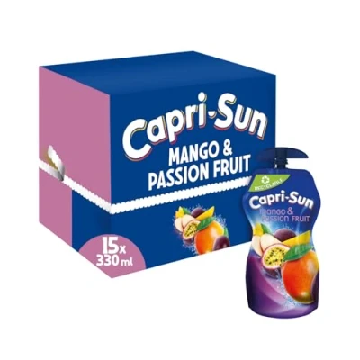 Capri Sun Mango & Passionfruit Juice Drink Multipack (15 x 330ml) Big Pouches with Resealable Cap Made Real Fruit No Preservatives, Artificial Colours, or Flavours Vegan, Gluten Free