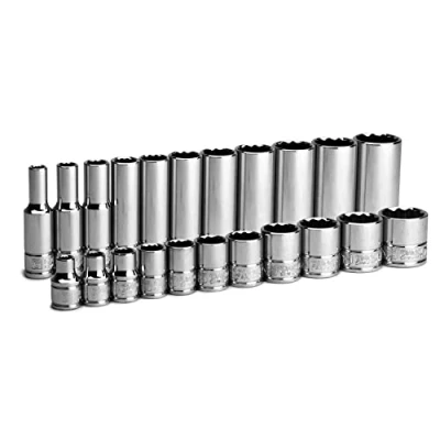 These high performance 12-point sockets are what you need to tackle 12-point fasteners as well as hex and square fasteners Premium Chrome Vanadium steel tempered with our proprietary heat treatment process to withstand more torque MaxChrome plating, achieved through thorough polishing and careful application of chrome protective plating, ensures durability and corrosion resistance Precise 12-point socket with WaveDrive design grips fasteners more tightly than traditional design, preventing fastener rounding and giving you more leverage 22-piece set includes (11) 3/8 in. drive 12-point deep sockets: 1/4, 5/16, 3/8, 7/16, 1/2, 9/16, 5/8, 11/16, 3/4, 13/16, 7/8 in., (11) 3/8 in. drive 12-point shallow sockets: 1/4, 5/16, 3/8, 7/16, 1/2, 9/16, 5/8, 11/16, 3/4, 13/16, 7/8 in.