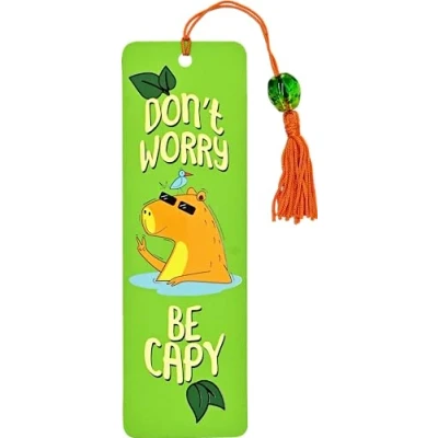 'Don't Worry, Be Capy.'' Fun beaded bookmark depicts an adorable capybara, chillin' with a feathered friend. Cute and colorful design ''pops'' with gloss highlights. Attached: A silky matching tassel with a hand-selected accent bead. Bookmark is printed on sturdy, smooth-finish card stock. A bonus on the back: A handy printed ruler in inches and centimeters. Bookmark measures 2-1/2'' wide x 7-1/8'' high. Bookmark is encased in a protective transparent plastic sleeve. Warning: Choking hazard, small parts. Not for children under 3 years.