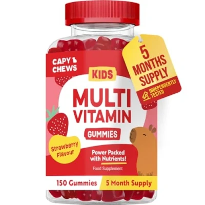 COMPLETE MULTIVITAMIN SUPPORT FOR KIDS – Fun and tasty strawberry-flavoured capybara gummies packed with 7 essential vitamins. Each daily chew supports your child’s immune system, bone health, energy, and vision, making nutrition easy, enjoyable, and fuss-free. IMMUNE DEFENCE, BONES, ENERGY & EYESIGHT – Enriched with Vitamins A, C, D3, E, B6, B12 and Niacin. Vitamin C helps reduce tiredness and supports strong immunity. Vitamin D3 contributes to healthy bones and teeth, while Vitamin A supports normal vision and growth. A complete blend to fuel your child’s daily wellbeing. 5 MONTH ULTRA SUPPLY – Each bottle contains 150 premium multivitamin gummies, giving your children a full 5 months of nutritional support. Build a strong foundation for your child’s immune system, healthy bones, and energy with our kids’ multivitamin gummies. CapyChews focus on providing premium formulated products, at exceptional value. NO NASTIES, TRUSTED & VERIFIED QUALITY – Expertly formulated, Non-GMO and Gluten-Free gummies. Our multivitamin gummies are carefully manufactured and independently tested to verify they contain exactly what we promise. Premium quality, safety, and peace of mind for parents, every time. LOW SUGAR, KID-FRIENDLY FORMULA – Our gummies are specially formulated with reduced sugar, giving your child the essential vitamins they need without unnecessary sugar. A healthier choice parents can trust.