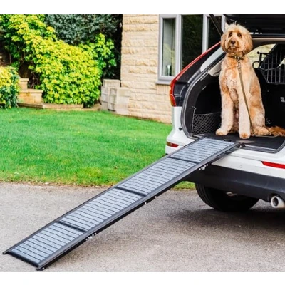 FOLDABLE DESIGN: Tri-fold construction of the dog car ramp allows for compact storage and easy transport, perfect for travel and space-saving convenience for your dog ramp. ANTI-SLIP SURFACE: Carpeted walking surface provides secure footing and confident climbing for pets of all sizes, which is also soft on their paws and safer than dog car stairs. PORTABLE CONVENIENCE: Lightweight yet sturdy construction makes it easy to set up and store in your vehicle's boot or garage, making it the perfect portable dog ramp. VERSATILE USE: Suitable for various vehicle types including cars, SUVs, and trucks, with adjustable height accommodation, the dog ramp for cars can also be used inside to get onto beds and sofa's if required. SAFETY FEATURES: The foldable dog ramp has a textured surface help prevent pets from slipping, while supporting their joints during entry and exit, great for a travel dog ramp.