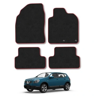 Car Mats Compatible with Nissan Qashqai (2007 2014) Tailored Fit Red Trimmed Carpet Floor Mat Set Accessory Black Custom Fitted 4 Pieces Clips Anti Slip Backing & Trim Edging