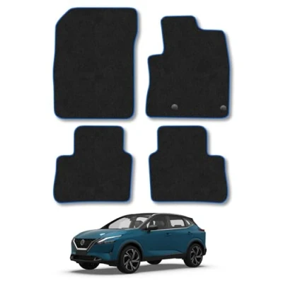 Car Mats Compatible with Nissan Qashqai 2021 Onwards Tailored Fit Blue Trimmed Carpet Floor Mat Set Accessory Black Custom Fitted 4 Pieces Clips Anti Slip Backing & Trim Edging