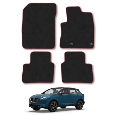 Car Mats Compatible with Nissan Qashqai 2021 Onwards Tailored Fit Red Trimmed Carpet Floor Mat Set Accessory Black Custom Fitted 4 Pieces Clips Anti Slip Backing & Trim Edging