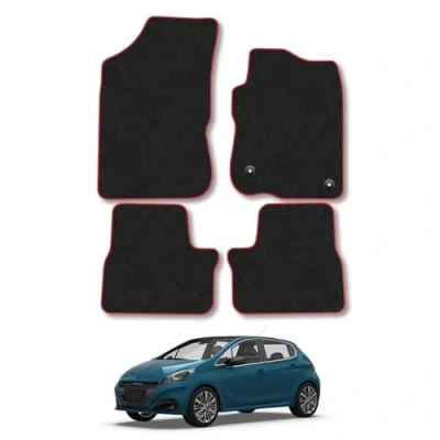 Car Mats Compatible with Peugeot 208 (2012 2020) Tailored Fit Red Trimmed Carpet Floor Mat Set Accessory Black Custom Fitted 4 Pieces Clips Anti Slip Backing & Trim Edging