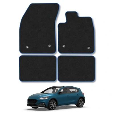 Car Mats Compatible with withd Focus (2018+) [MK4] Tailored Fit Blue Trimmed Carpet Floor Mat Set Accessory Black Custom Fitted 4 Pieces Clips Anti Slip Backing & Trim Edging