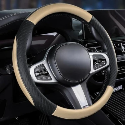 Car Steering Wheel Cover Leather Soft Microfiber Universal Size M 37 38cm /14.5 15inch, Anti slip, Breathable, Beige