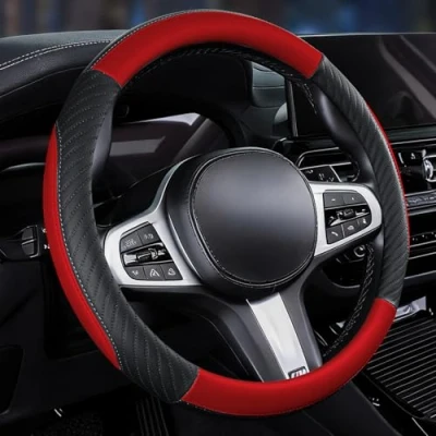 Car Steering Wheel Cover Leather Soft Microfiber Universal Size M 37 38cm /14.5 15inch, Anti slip, Breathable, Red