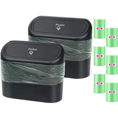 Car Trash Can, 2 Mini Accessories with Lid and 120pcs Bag, Cute Organizer Bin, Small Garbage Can for Storage Organization (White) (Black/Black)