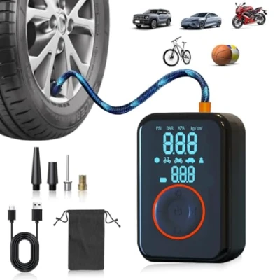Powerful Rechargeable Cordless Inflator – Portable Car VAN Tire Tyre air compressor Pump with 150PSI max pressure for fast inflation of car tyres, motorcycles, bicycles, and sports equipment., Digital Pressure Gauge & PRE-SET PSI – Large LED display shows PSI, BAR, KPA, and kg/cm² with accurate real-time pressure monitoring. You can set the Air Volume into the typre by using the Pre-Set PSI, BAR, KPA, and kg/cm² feature. Smart Auto Shut Off – Preset the desired pressure and the pump automatically stops when reached, preventing over-inflation. Rechargeable Battery & USB Charging – Built-in lithium battery with Type-C charging cable for convenient recharging anywhere. LED Light for Emergencies – Integrated LED torch provides illumination for night use, roadside emergencies, or low-light conditions.