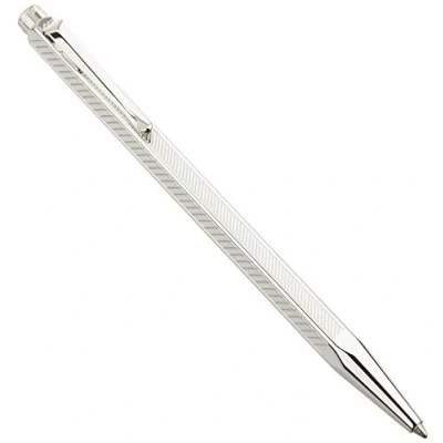Silver ballpoint pen with black leather case from Caran d'Ache The hexagonal shaft is made of brass Laser engraved Caran d'Ache logo on the push button The case is made of black grained calf leather and measures 16 cm x 3.3 cm The ballpoint pen has a length of 12.8 cm and a diameter of 8 mm