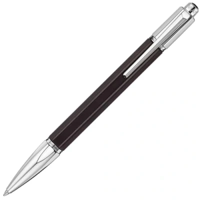 Hexagonal brass body made of ebony wood Presented in a Caran d'Ache case Rhodium and silver-plated clip and push button Equipped with the famous giant Goliath cartridge in medium black. Compatible with all types of Goliath cartridges. Made in Switzerland