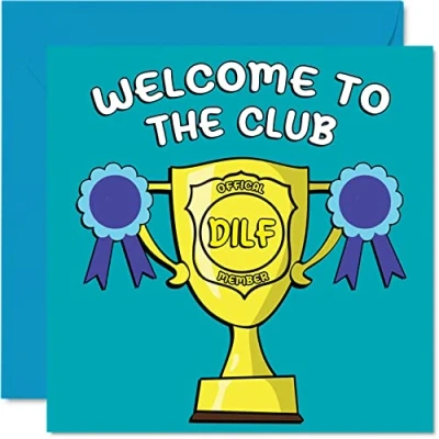 MAKE THEM SMILE WITH THIS AWESOME EXPECTANT FATHERS CARD: This exceptional quality card for expectant fathers shows the design of a trophy with rosettes with the wording "Welcome To The Club... DILF Offical Member". If you are looking for classy, high calibre greetings cards, then then this baby shower card for boys is bound to make them smile. This could also be for a Friend, Work Colleague, Brother, Uncle or Family Friend. WHAT DO YOU GET: The card is printed on one side and BLANK ON THE INSIDE to allow you to write your very own message. The unique fun design is printed on a specially sourced and environmentally responsible board. At 360 microns thick the natural white one-sided gloss board has a quality look and feel. Supplied with a coloured gummed envelope to complement the design and ready to be sealed and sent in the post. NO INK SMUDGES: There is nothing worse than writing inside a card to find that the shiny surface makes the ink smudge. This is why we use a high quality one sided coated board. The uncoated side will absorb more of the ink from your pen to make smudging a thing of the past. SIZES: Greeting Card = 145mm x 145mm, Envelope = 155mm x 155mm, Card Thickness = 360 micron. MADE AND QUALITY CHECKED IN THE UK: We print and manufacture all our product right here in the UK so you can be sure of a fast turnaround and a product that is expertly made. Using the very best Forest Stewardship Council certified board our card is conscious of the responsible management of the world's forests - milestone baby cards, birth cards for baby.