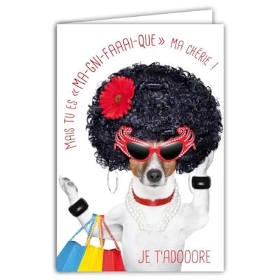 Card for Girl Woman Beautiful Fashionable Queen of Shopping Humorous Message with Illustrated Envelope Size 17.5 x 12 cm Funny Dog Fancy Dress Design Made in France 69 6218