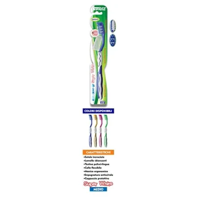 Curadent Nylon Bristle Toothbrush with Protective Hood and Non-slip Grip 12 Pieces Assorted Colours CuraDent SUPER WHITE: Crossed bristles Whitening slats, tongue cleaner head Flexible neck Farma Care : since 1958 at the service of Health
