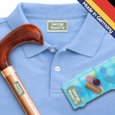 NOTHING MORE TO LOSE: Our clothes labels for care homes & nursing homes ensure that no more personal clothing or items get mixed up. STICK ON LABELS: Our name stickers are simply stuck onto the care label or other and do not need to be ironed. Due to the dimensions of 30 x 13 mm our stickers fit on all care labels, shoes and other surfaces. WASHABLE: The laundry labels are washing machine and dishwasher safe. The stickers have passed countless tests in the washing machine, dishwasher and dryer! INDIVIDUALISABLE: Our name stickers for clothes & other are 100% personalised! You can choose between four different sticker colours and enter the text / name individually. 100% CLIMATE-NEUTRAL: Our clothing labels for care homes are climate-neutral, with every tag produced, we support climate projects.