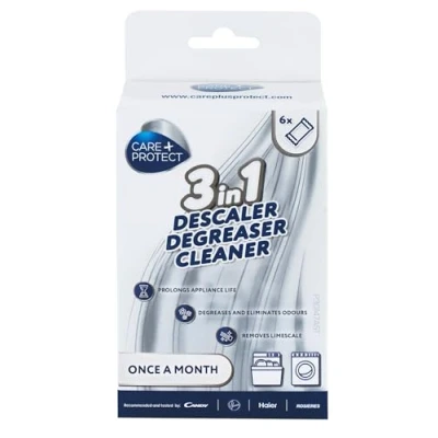 3-IN-1 DEEP CLEAN: CARE + PROTECT descaler effectively combines descaling, degreasing and sanitizing action for washing machines, washer-dryers and dishwashers in one product LIMESCALE REMOVER: CARE + PROTECT's 3-in-1 removes traces of limescale from pipes, filters and internal appliance components in just one empty wash cycle DEGREASER AND SANITIZER: CARE + PROTECT's 3-in-1 washing machine and dishwasher cleaner removes even the most persistent dirt and grease residual, preventing mold and unpleasant odours CARE AND MAINTENANCE: Using a sachet once a month ensures deep cleaning, extends the life of the appliance, and helps reduce energy consumptions, monthly usage is recommended EASY TO USE: For an effective result, simply pour the sachet's content into the washing machine drum (for dishwasher, pour half sachet of the product into the detergent dispenser, another half at the bottom of the cavity). Then start an empy wash cycle, without pre-washing