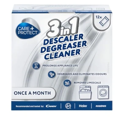3-IN-1 DEEP CLEAN: CARE + PROTECT descaler effectively combines descaling, degreasing and sanitizing action for washing machines, washer-dryers and dishwashers in one product WASHING MACHINE AND DISHWASHER LIMSCALE REMOVER: CARE + PROTECT's 3-in-1 removes traces of limescale from pipes, filters and internal appliance components in just one empty wash cycle DEGREASER AND SANITIZER: CARE + PROTECT's 3-in-1 washing machine and dishwasher cleaner removes even the most persistent dirt and grease residual, preventing mold and unpleasant odours DEGREASER AND SANITIZER: CARE + PROTECT's 3-in-1 washing machine and dishwasher cleaner removes even the most persistent dirt and grease residual, preventing mold and unpleasant odours EASY TO USE: For an effective result, simply pour the sachet's content into the washing machine drum (for dishwasher, pour half sachet of the product into the detergent dispenser, another half at the bottom of the cavity). Then start an empty wash cycle, without pre-washing
