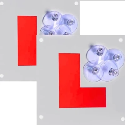 MAGNETIC DESIGN: Strong magnetic backing allows secure attachment to vehicle surfaces whilst being easily removable when needed REFLECTIVE SURFACE: High-visibility reflective material ensures clear visibility during night-time driving conditions SUCTION CUP MOUNT: Four robust suction cups provide additional stability and secure mounting on vehicle surfaces WATERPROOF CONSTRUCTION: Weather-resistant materials protect against rain, snow, and harsh weather conditions COMPLETE SET: Package includes 2 L-plates with both magnetic backing and suction cups for versatile mounting options