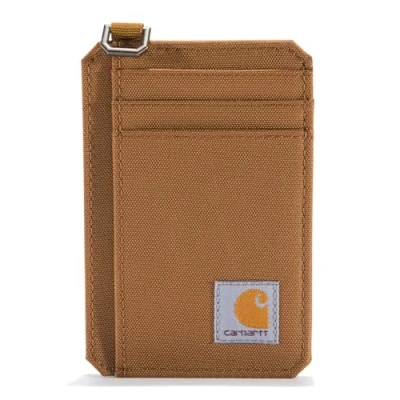 Carhartt Men's Nylon Duck Front Pocket Wallet. Front pocket wallet that's water-repellent and built to last If a leather wallet doesn't stand a chance on your jobsite, this Carhartt duck wallet is a durable option for you. It's made of rugged CORDURA with a water-repellent coating to help protect against damage Slip it into your front pocket, or attach it to a lanyard (lanyard not included). Contains 6 to 9 Cards. CORDURA 500-denier nylon with Rain Defender durable water repellent, water resistant interior structure keeps wallet shape in damp or wet conditions, Carhartt patch, custom D-ring hardware, iconic blanket liner Dimensions: 4.53" x 3.15"