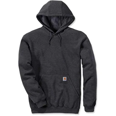 Loose fit Mid weight fleece Attached three-piece hood with adjustable draw cord Long sleeve Two lower front hand warmer pockets Stretchable, elastane reinforced rib knit cuffs and waistband Carhartt label sewn on pocket