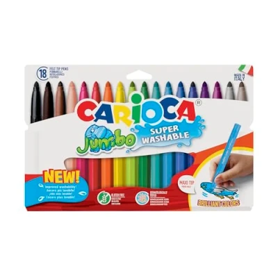 Box of 18 CARIOCA Jumbo markers for children: maxi tip (6mm) with ventilated cap and anti-choking blocked tip; maxi octagonal body; super washable ink; gluten free The Jumbo line is designed for the little ones: the markers have a large octagonal body for easier grip; the ventilated cap and the locked tip reduce the risk of choking. Warnings: Not suitable for children under 3 years of age. Contains small, detachable parts. Choking hazard. All CARIOCA products are dermatologically tested. For over 50 years CARIOCA has been a symbol of the best Made in Italy with products designed to develop children's creativity: markers, colored pencils, tempera, crayons, educational games and more The inks of CARIOCA markers are produced entirely in the Settimo Torinese factories with food-grade dyes and ensure unbeatable levels of washability and brilliance.
