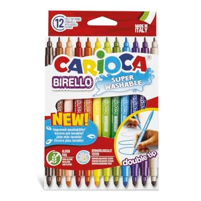 Box of 12 CARIOCA Birello double tip markers: fine tip diameter 2.6mm and medium tip diameter 4.7mm; ventilated anti-choking cap; long-lasting ink; bright colors The ink in CARIOCA Birello markers is super washable (from skin and most fabrics with just water and no soap), non-toxic, and uses only food and/or cosmetic colourings. Warnings: For children under 3 years of age, use only under adult supervision. Read and keep the warnings. For over 50 years CARIOCA has been a symbol of the best Made in Italy with products designed to develop children's creativity: markers, colored pencils, tempera, crayons, educational games and more The inks of CARIOCA markers are produced entirely in the Settimo Torinese factories with food-grade dyes and ensure unbeatable levels of washability and brilliance.