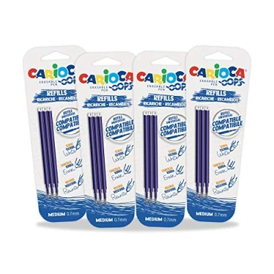 Set of 12 refills for CARIOCA OOPS erasable pens, blue, 0.7mm tip, thermosensitive ink. Universal refills compatible with most pens. The erasable ink of OOPS CARIOCA refills for OOPS CARIOCA erasable pens is suitable for school and office use, not recommended for legal documents. Warnings: Store at a maximum temperature of 40°C. All CARIOCA products are manufactured and tested with the utmost care, quality, and safety. For over 50 years CARIOCA has been a symbol of the best Made in Italy with products designed to develop children's creativity: markers, colored pencils, tempera, crayons, educational games and more The inks of CARIOCA markers are produced entirely in the Settimo Torinese factories with food-grade dyes and ensure unbeatable levels of washability and brilliance.