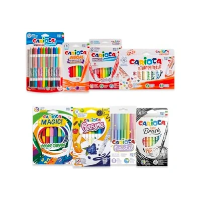 Assorted CARIOCA markers: 12 BiColor, 8 Neon, 12 Birello, 12 Stamperello, 10 Magic Color Change (Magink marker included), 12 Perfume, 8 Pastel, 10 Super Brush The scented markers have a conical tip and come in a variety of fragrances: the selected aromas recall natural essences. They are allergen-free. Warnings: For children under 3 years of age, use only under adult supervision. Read and keep the warnings. For over 50 years CARIOCA has been a symbol of the best Made in Italy with products designed to develop children's creativity: markers, colored pencils, tempera, crayons, educational games and more The inks of CARIOCA markers are produced entirely in the Settimo Torinese factories with food-grade dyes and ensure unbeatable levels of washability and brilliance.