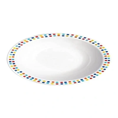 Colour: White with a multi-coloured mosaic effect around the rim Shape: Round Dishwasher safe Hygienic and durable alternative to china
