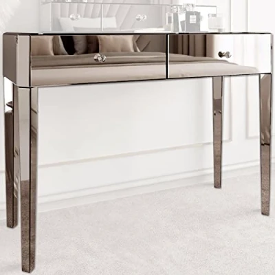 ManoManoGeneral description Elevate your style to the next level in luxury with the beautiful Ivy mirrored dressing table. This piece can be styled as a dressing table or a console table, adding understated elegance to your bedroom, dressing room, or hallway. It features two spacious drawers with crystal style handles. The mirrored legs provide solid support and a seamless look. This stunning piece can serve as a statement stand-alone feature in your home or be combined with a selection of tri-fold and Hollywood mirrors. Technical specifications Product Dimensions: L110 x D39 cm x H79 cm