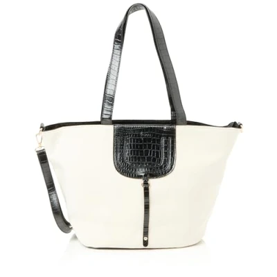 Feminine shopper Made of light canvas fabric Faux leather patches with crocodile embossing Large lined interior Side inner pocket