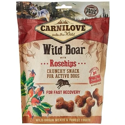 Carnilove Crunchy Snack Wild Boar with Rosehips with fresh meat Delicious wild boar snack suitable for active dogs. With rosehips, a natural source of vitamin C for fast recovery Complementary dog food Package: 200gComposition: wild boar 50% (dried wild boar 35%, fresh wild boar 15%), pumpkin 15%, yellow peas 8%, dried apple 5%, carrots 5%, chickpeas 4%, rosehips 4%, chicken fat (preserved with tocopherols) 4%, flaxseed 2%, dried spinach, 2%, linseed oil 1%Analytical Constituents: Analytical ingredients in 1 kg: Crude protein 33.0 %, fat content 12.0 % ,moisture 10.0 %, crude ash 6.0 %, crude fibre 4.0 %, calcium 1.2 %, phosphorus 0.8 %, omega-3 0.2 %, omega-6 1.0 %Vitamins & Minerals: Contains natural antioxidants. Metabolizable energy: 3 600 kcal/kg