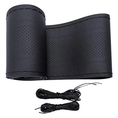 Carodi Universal Leather Steering Wheel Cover Hand Stitched Breathable Anti Slip DIY (Black)