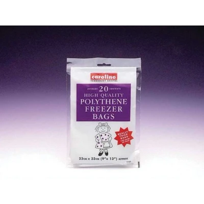 Caroline Freezer Bags, 23 x 33cm (pack of 20), are durable, leak-resistant polythene bags ideal for storing bulk foods like meats, vegetables, and baked goods. Featuring a secure seal for freshness, they’re perfect for meal prep, freezer organization, and can be reused for non-greasy items.