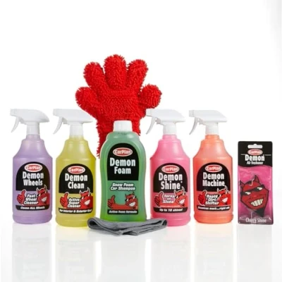 KIT INCLUDES: This kit includes Demon Machine, Demon Foam, Demon Wheels, Demon Clean, Demon Shine, Demon Air Freshener, Demon Wash Mitt and 2 microfibre cloths COMPLETE CAR CLEANING KIT: Everything you need for a full interior and exterior vehicle clean, delivering a fresh and spotless finish DEMON MACHINE: Effectively dissolves heavy soils and stains, making it faster and easier to achieve a spotless, pristine vehicle DEMON WHEELS & TYRES: Removes brake dust, oils, and road grime with Demon Wheels, followed by Demon Tyres to give your wheels a full, fresh look DEMON FOAM & SHINE: Creates a dense foam that clings to paintwork to lift dirt, while Demon Shine locks in the finish for a long-lasting just-waxed look
