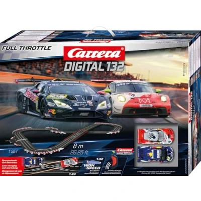 Ultimate racing experience: Carrera Digital 132 'Full Throttle' set offers realistic slot car racing on an 8 metre long track. With front, rear and brake lights for authentic driving pleasure Top racing cars: includes the Porsche 911 GT3 R Lionspeed GP No24 and the powerful Lamborghini Huracán GT3 Evo 2 Abt-Sportsline No27 EXTENDABLE TRACK: The track offers high-speed straights, tricky curves and a double turnout. It is expandable and thus offers endless possibilities for racing action WIRELESS CONTROL: with the wireless hand controllers you can control up to 6 cars at the same time. Ensures long driving pleasure without interruptions Suitable for all age groups: ideal for children aged 8 and up and adults. With a scale of 1:32, this set is perfect for racing lovers, Manufacturer: Carrera Revell Europe GmbH