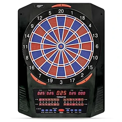 Dartboard for the home: electronic dart board with 40 games, 761 game variants and handicap option. Ideal as a dart board for professionals and beginners Special features: sound effects with sound prompt on throw, as well as dual input/output options always ensure tension on the E-Darts disc Classic design: the electric dartboard with 2 hole segments in blue-red and white spider, has 9 displays, including 4 large cricket displays with circle/cross symbol VERSATILE DART FUN - The dart computer is suitable for 1-8 players and allows popular dart games like all 301 variants, cricket with its own cricket indicator, etc. Accessories included: the darts set includes in addition to the throwing disc with black recovery ring, 6 soft darts, 20 additional spikes, as well as an adapter/power supply and instructions (English language not guaranteed)