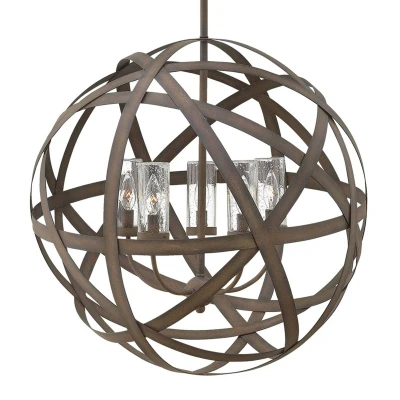 Crafted with a unique aesthetic in mind, the Carson pendant features bold overlapping metal ribbons that create a captivating spherical shape. The lamp is constructed from high-quality steel with a vintage iron finish, providing not only a stylish look but also durability. The natural finish is elegantly complemented by seeded glass shades that add a warm, inviting glow when illuminated. This perfect blend of materials ensures that the light adapts beautifully in various settings, from modern to nostalgic, enhancing your décor with ease.