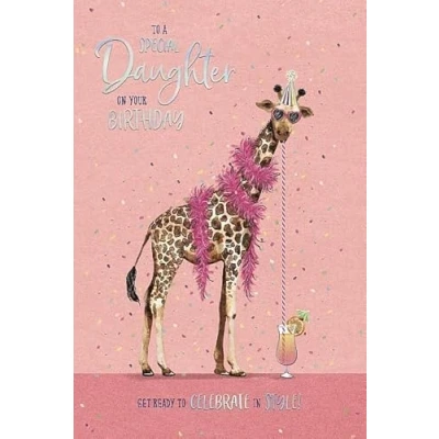 HUMOROUS BIRTHDAY CARD: A funny card, suitable for sending a kind, heartfelt message to your lovely Daughter to brighten her day. AMUSING UNIQUE DESIGN: featuring a colourful design of a giraffe wearing a feather bower, drinking a cocktail while being surrounded by confetti, with a "To a Special Daughter on your Birthday Get ready to celebrate in style!" message on the front, finished with metallic silver foil details. The card comes with a coordinating envelope. BRANDED PREMIUM QUALITY CARD: This card is manufactured by Carte Blanche Greetings, a UK card company, renowned for creating innovative and attractive designs, on high quality board, finished to an excellent standard. CARD MEASURES: 152 x 227 mm GREETING: The greeting inside this card reads "Wishing you a Very Happy Birthday with Lots of Love". ENVIRONMENTALLY FRIENDLY: Reassuringly, this card will not harm our precious planet. It is eco-friendly and sustainable, using paper and ink from responsibly managed sources. BRIGHT CARD: This comical card will let your special Daughter know that she is in your thoughts and that you want to send her good wishes on her special day. Receiving a card always makes someone feel good, giving them a warm feeling to know that someone has taken the time to select a card especially for them. In times like these, adding some kindness, happiness and positivity into someone's day, giving them something to smile about, is more important than ever.