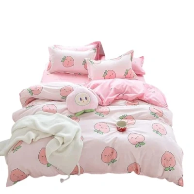 Cartoon Duvet Cover Set Double Pink Peach Bedding Kid Kawaii Girl Lovely Comforter Cute Fruits Quilt Tropical Plant Reversible Soft Bedspread Room Decor
